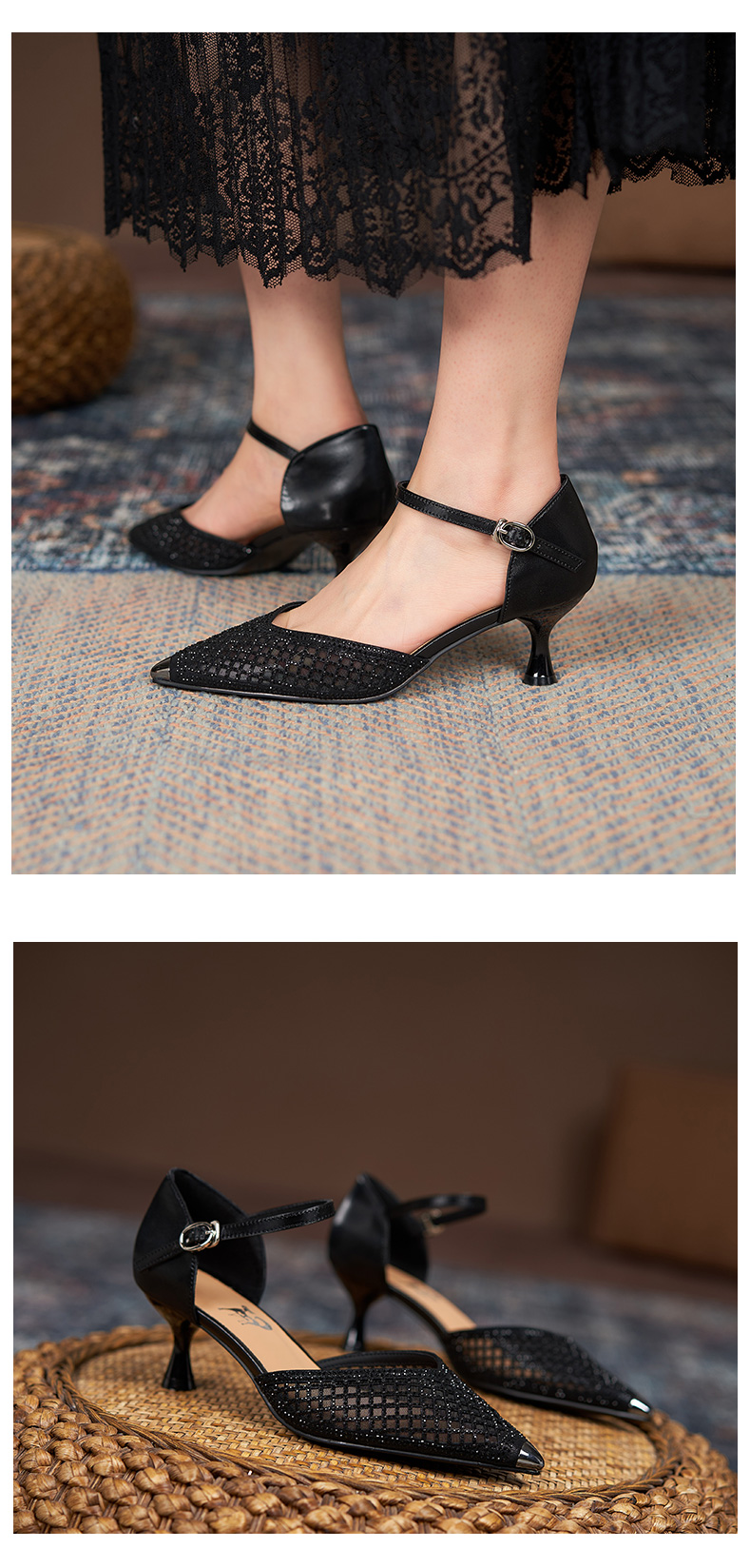 細跟包頭涼鞋女2021年新款夏中跟單鞋帶鉆鏤空網紗一字帶羅馬涼鞋